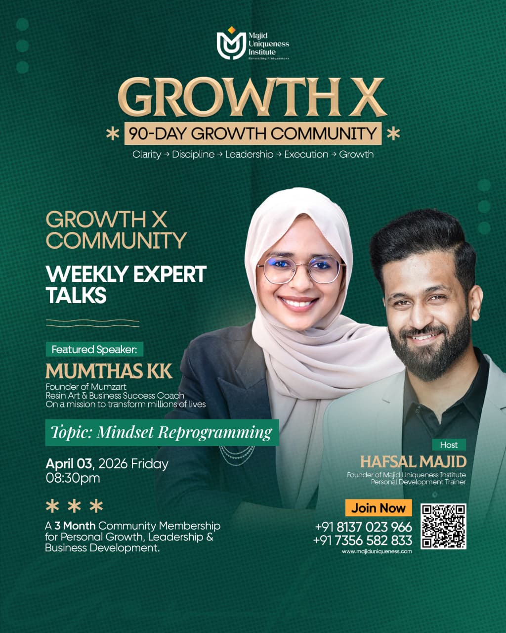 - Week 2 – Mindset Reprogramming – April 3 – Mumthas KK (Founder of Mumzart, ResinArt & Business Success Coach).