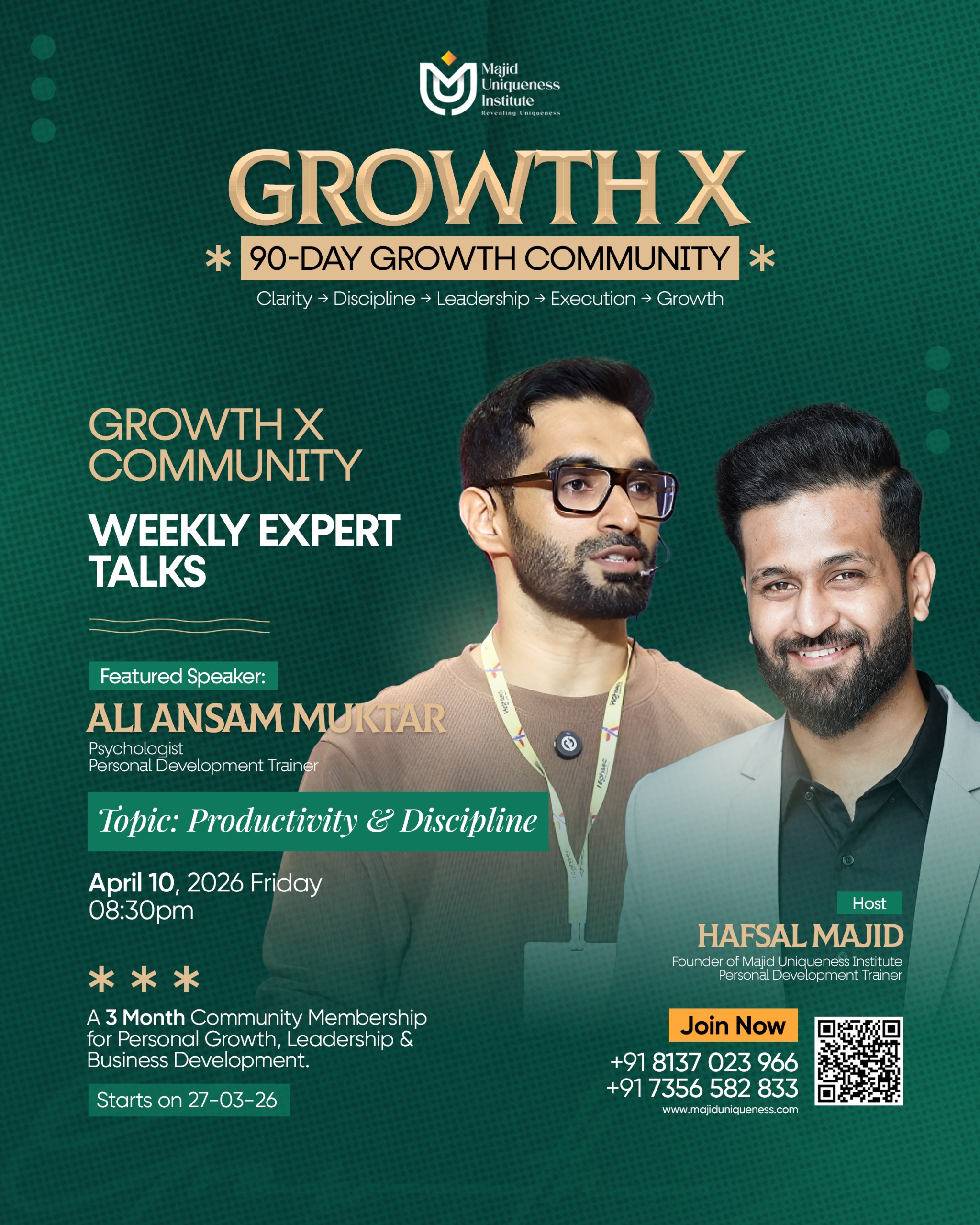 - Week 3 – Productivity & Discipline – April 10 – Ali Ansam Muktar (Psychologist, Personal Development Trainer).