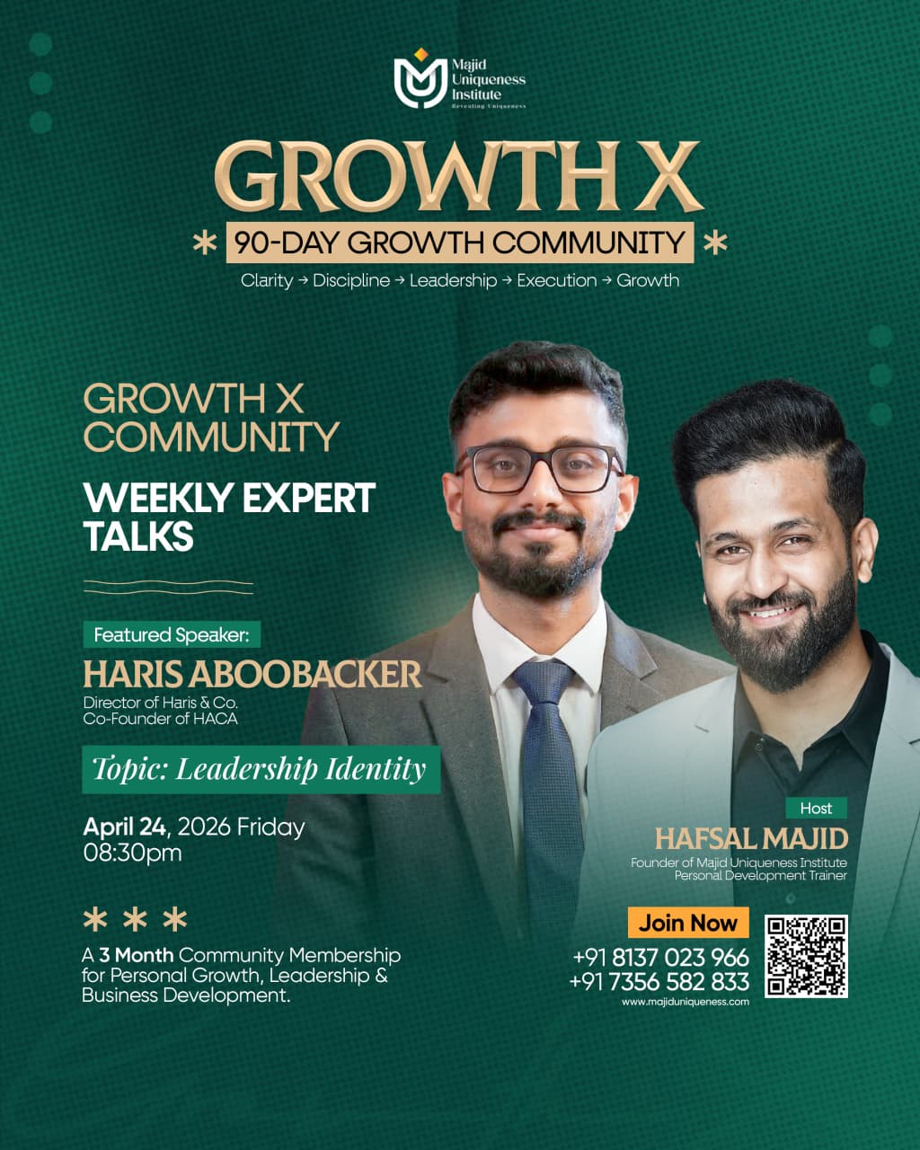 - Week 5 – Leadership Identity – April 24 – Haris Aboobacker (Author, Founder of Haris & Co., C0-Founder of HACA, TedX Speaker).