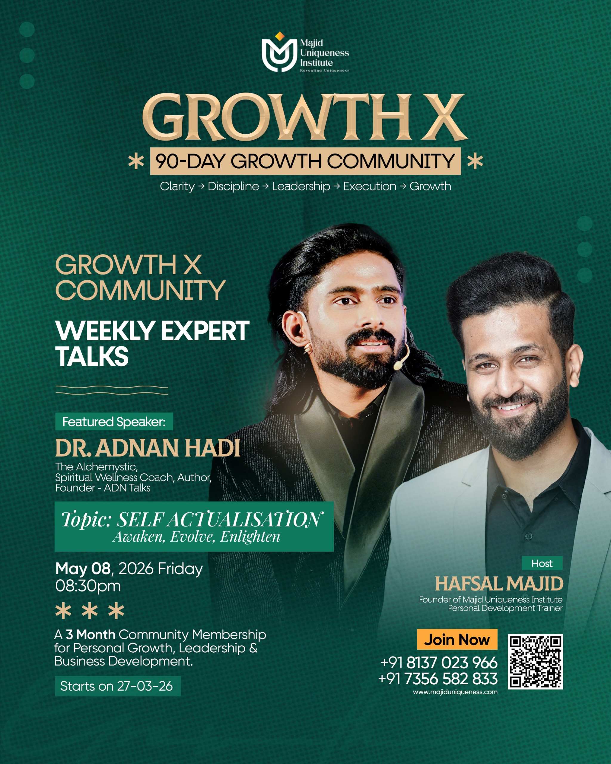 - Week 7 – Self Actualisation – May 8 – Dr. Adnan Hadi (The Alchemystic, Spiritual Wellness Coach, Author, Founder of ADN Talks).
